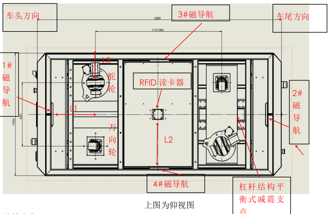 磁導(dǎo)航固定在車(chē)體安裝,杠桿結(jié)構(gòu)平衡式減震機(jī)構(gòu)安裝方式如下: